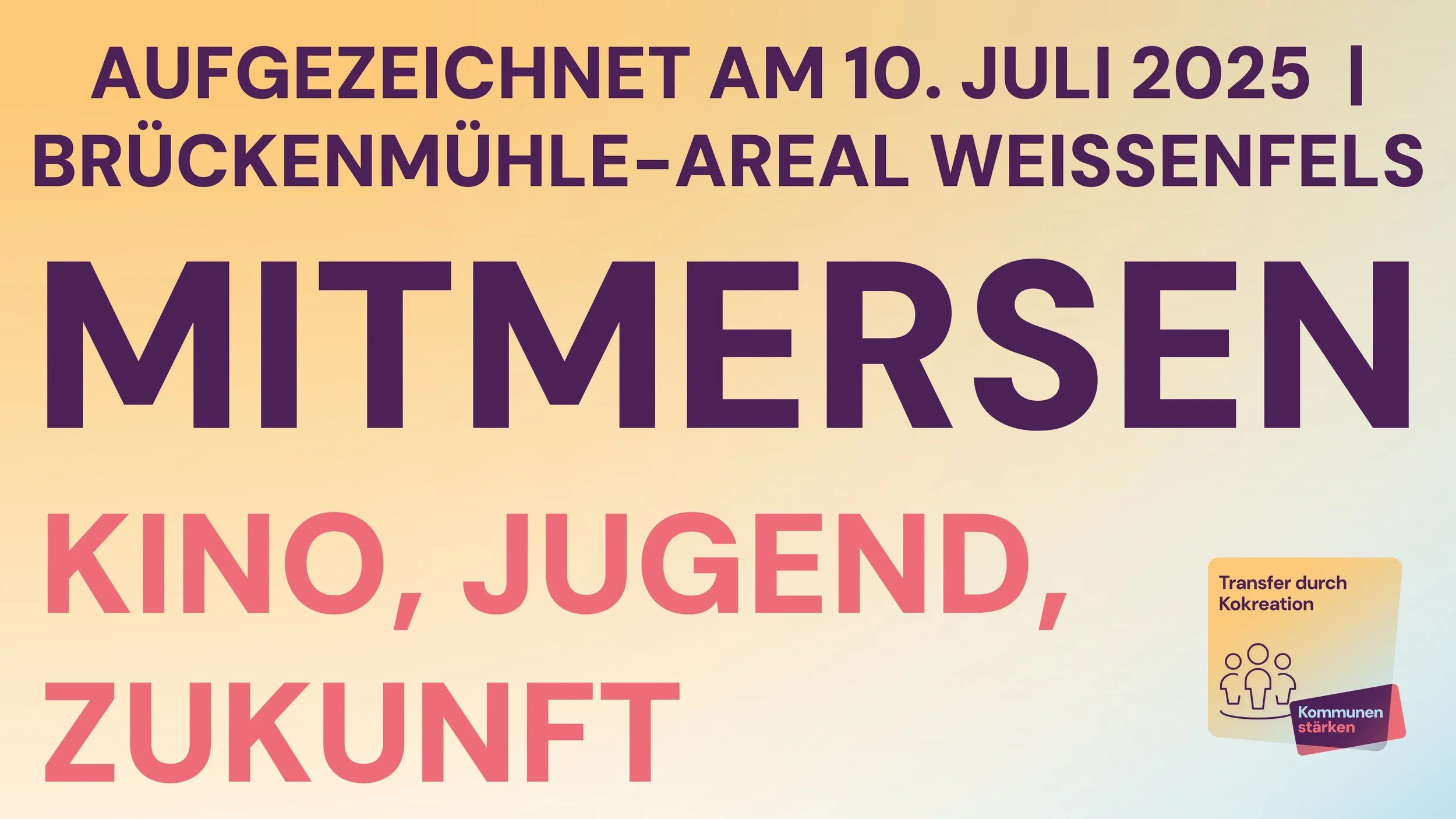 Das Sommerkino wurde 2025 erstmalig von Jugendgremium und Verwaltung der Stadt Weißenfels geplant und durchgeführt. Begleitet wurde der Prozess von Studierenden des Mastermoduls Stadtmanagement II der Universität Leipzig im Kontext des Projekts “Transfer durch Kokreation”. Im Gespräch stellen die Studierenden Zwischenergebnisse aus der gemeinsamen Arbeit mit Verwaltung und Jugendgremium vor. Besprochen werden der Stand der Etablierung des Kinos sowie Möglichkeiten zur zukünftigen Unterstützung des Jugendgremiums: Wie lief die Zusammenarbeit zwischen Studierenden, Jugendgremium und Stadtverwaltung? Welche Chancen und Herausforderungen gibt es bei der Beteiligung? Was braucht es, damit Jugendbeteiligung mehr ist als nur ein gutes Schlagwort? Das Gespräch bildet zugleich den Auftakt für die Live-Podcast Reihe “Mitmersen”. Diskutiert haben 15 Personen, mit dabei Martin Papke (Oberbürgermeister), Christian Endt (Kulturamtsleiter), Kathrin Mavromatis (Koordinatorin des Neustadtbüros), Vertreterinnen des Jugendgremiums, Katrin Schade (Koordinatorin “Transfer durch Kokreation”) sowie die Studierenden.