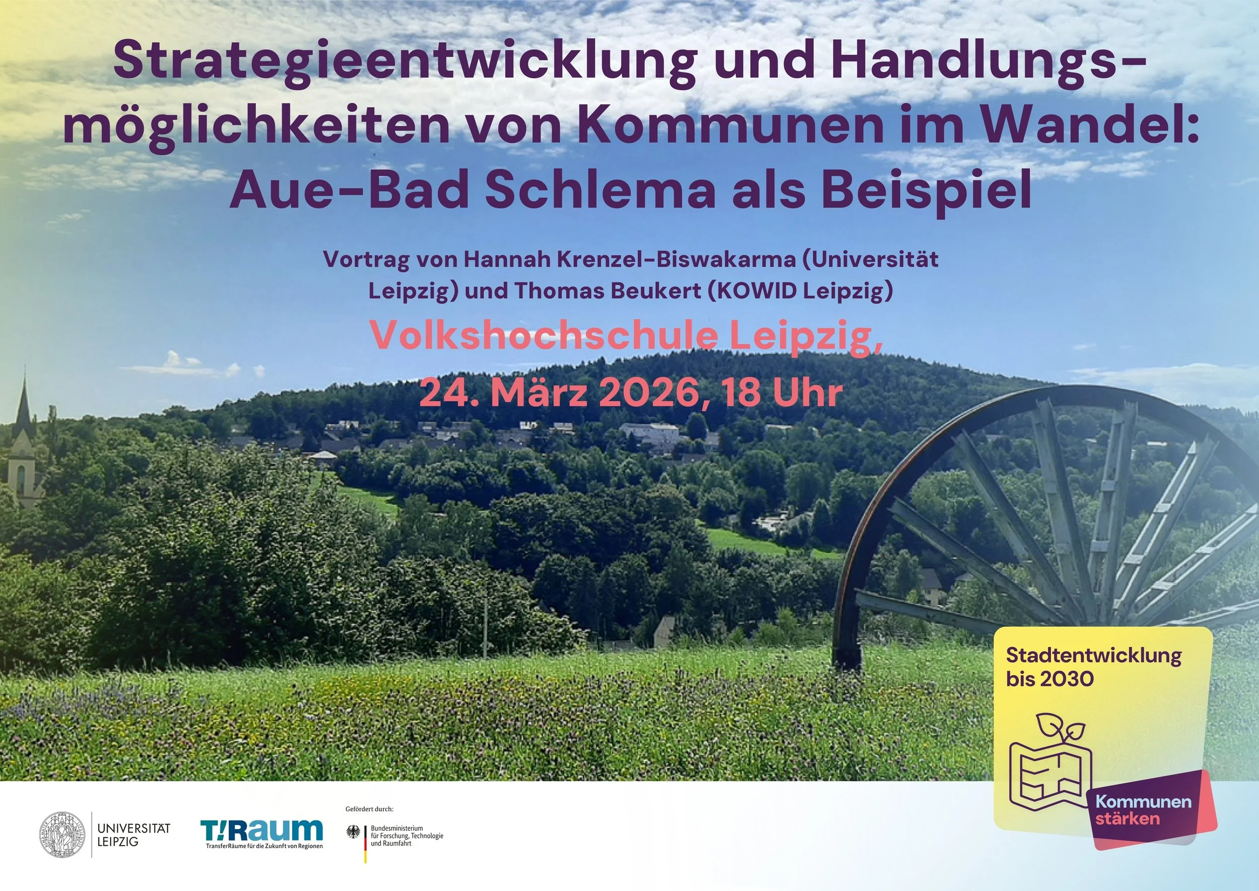 Am 24. März 2026 stellen Hannah Krenzel-Biswakarma (Universität Leipzig) und Thomas Beukert (KOWID, Leipzig) aus dem Werkstattprojekt „Stadtentwicklung bis 2030“ im Vortrag in der Volkshochschule Leipzig in Kooperation mit der Geographischen Gesellschaft zu Leipzig erste Ergebnisse vor.